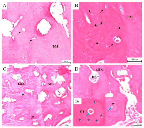 The histological evaluation of the bone formation. (A) Three months from implantation a new, immature bone with the bone matrix (BM) and typical cement lines (black arrow) is shown. (B) Four months after implantation the woven bone with a high number of osteoblasts (black asterisk) in the bone matrix (BM) and cement lines (black arrow) is still observable. (C) Five months after surgery, the bone matrix consists of area with immature, woven bone (homogeneous and fibrous structure) with cement lines (black arrow). In this sample differences between immature (IMB) and mature (MB) bone tissue are visible. (D) Six months after implantation the mature bone is fully developed and characterized by typical bone structures such as osteocytes, osteons (O), a cavity with the bone marrow (CBM) and haematopoietic cells (HEC) in the mineralised bone matrix. (Da) The osteon (O) is a structure of the mature bone, where a typical osteocyte (blue asterisk) arrangement with the Haversian system (blue arrow) in the middle is visible.