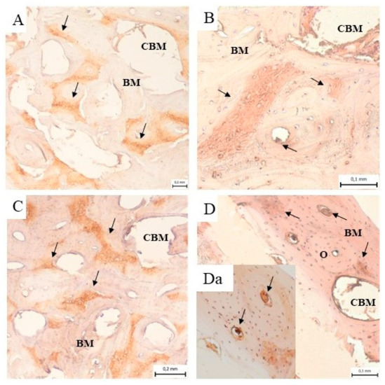 Immunohistochemical analysis of the samples from the cortical bone defect in a mandible treated with an HAP ceramic plate shows the presence of collagen I (black arrow) in the bone matrix (BM) of compact bone, in the spongy bone and around the bone marrow cavities (CMB) (A) 3 months, (B) 4 months, (C) 5 months and (D) 6 months after implantation. (Da) The presence of the expressed collagen I (black arrow) within and around the osteons (O).