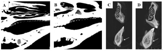 The computerized tomography section demonstrates high resolution of the sagittal plane (A,B), Pos: 0.3, Plane: (1.00, 0.00, −0.00, −0.28), W: 100, L: 35 and axial plane (C,D) Pos: −21.3, Plane: (0.00, −0.00, 1.00, 21.25), W: 100, L: 35, which proves the total regeneration of the cortical bone tissue (black and white arrows show the surgical area) after treating with the HAP ceramic plate.