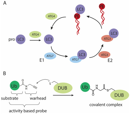 Schematic representation of (A) the (de)conjugation machinery involved in maturing and processing LC3, (B) the mode of action of an active cysteine deubiquitylating protease (DUB) on a propargylamide activity-based probe.