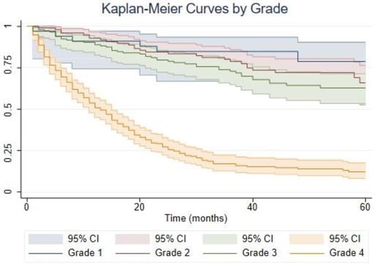 Kaplan–Meier plot by grades. CI-confidence interval.