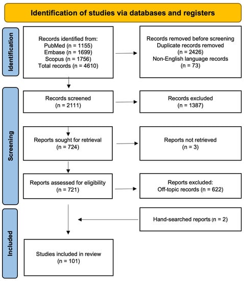 A comprehensive review of the literature was carried out through Medline/Pubmed, Embase, and Scopus databases. Keywords were searched in the Title/Abstract fields; no date restriction was set; only publications in the English language were included. The Preferred Reporting Items for Systematic Reviews and Meta-Analyses (PRISMA) guidelines [] were followed in the screening procedure. The search strings included keywords related to treatment resistance/unresponsiveness, schizophrenia/psychotic disorders, and dopamine. The search string is reported as follows: ((((((((((((((“treatment resistant”[Title/Abstract]) OR (treatment-resistant[Title/Abstract])) OR (“ultra resistant”[Title/Abstract])) OR “resistance”[Title/Abstract])) OR (“resistant”[Title/Abstract])) OR (“treatment refractory”[Title/Abstract])) OR (“refractory”[Title/Abstract])) OR (treatment-refractory[Title/Abstract])) OR (“refractoriness”[Title/Abstract])) OR (“unresponsive”[Title/Abstract])) OR (non-responsive[Title/Abstract])) OR (“clozapine”[Title/Abstract])) OR (ultra-resistant[Title/Abstract])) AND (((((“first episode psychosis”[Title/Abstract]) OR (“schizophrenia”[Title/Abstract])) OR (“psychotic”[Title/Abstract])) OR (“psychosis”[Title/Abstract])) OR (“first episode”[Title/Abstract]))) AND (“dopamine”[Title/Abstract]). The latest update of available literature was conducted on 17 February 2023. The search returned 4610 articles. After removing duplicates, 2184 papers were retrieved. All publications were screened by title and abstract to remove not pertinent articles. The outcomes at this stage were: (i) any type of direct neurobiological comparison between treatment resistant and treatment responder patients involving dopamine-related mechanisms; and (ii) any type of dopamine-related neurobiological correlate of response to antipsychotics. After this step, a total of 724 publications were selected, and the full paper of all was read. Again, non-pertinent publications were removed, and the resulting ones formed the literature base for the present work. These latter steps were carried out separately and in blind by two experimenters (L.V., G.D.S.). In case of lack of agreement (publications removed by one and included by the other), the first author was in charge of deciding. Additional publications were hand-searched based on the references of included publications. At the end of the screening process, a total of 101 articles were included in the qualitative synthesis. Figure 1 illustrates the PRISMA flow diagram, showing the different stages of paper selection. Additional reports on dopamine-related molecular mechanisms putatively implicated in the pathophysiology of schizophrenia or in the antipsychotic mechanism of action were included in the manuscript to enlarge the discussion of the purported dopamine basis of resistance to antipsychotic treatment.