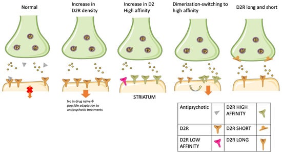 One proposed mechanism for psychosis is that the levels of D2Rs in the high-affinity state (rather than the whole D2R pool) are increased during psychotic conditions []. According to this hypothesis, D2Rs may exist in two functional states: a high-affinity one (D2High), with high affinity for endogenous and exogenous agonists, that is linked to second messenger cascades and a low-affinity one (D2Low) that is functionally inert []. It has been reported that an up-regulation of D2High represents the final common lesion of all preclinical models of psychosis []. Thereby, excessive D2High-mediated dopamine neurotransmission may be at the basis of striatal hyperdopaminergia that has been described in schizophrenia []. Accordingly, the lack of response to antipsychotics may be caused by extremely up-regulated D2High.