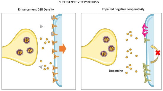 Molecular mechanisms of supersensitivity psychosis. Dopamine supersensitivity psychosis (DSP) is a condition of acquired treatment resistance. An accurate definition requires three clinical features: (1) re-appearance of positive psychotic symptoms despite ongoing antipsychotic therapy; (2) abnormal involuntary movements; (3) absent or negligible life events exacerbating the psychosis. The figure illustrates two different putative mechanisms involved in the pathophysiology of the DSP-acquired form of TRS. Left panel: chronic or subchronic exposure to antipsychotics yields an adaptation of postsynaptic sites, which increase D2R expression on the membrane to overcome receptor blockade and diminish D2R-mediated downstream signaling. Right panel: under physiological circumstances, D2Rs can aggregate in oligomers. The binding of dopamine to one D2R causes, in turn, the unoccupied receptors to switch to a low-affinity state. The disruption of this mechanism of “negative cooperativity” is supposed to cause a condition of supersensitivity to dopamine. Indeed, antipsychotics would no longer be able to block downstream signaling.