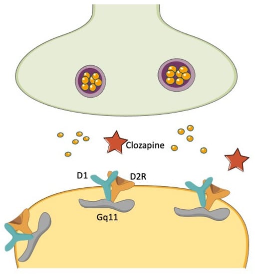 - Dziedzicka-Wasylewska, M.; Faron-Gorecka, A.; Gorecki, A.; Kusemider, M. Mechanism of action of clozapine in the context of dopamine D1–D2 receptor hetero-dimerization--a working hypothesis. Pharmacol. Rep. 2008, 60, 581–587. [Google Scholar]