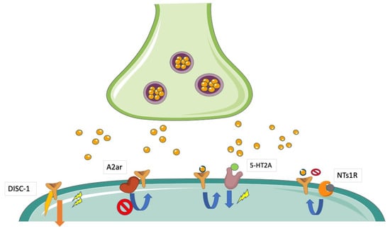 One widely studied heterocomplex is formed by adenosine A2A receptors (A2ARs) and D2Rs (Figure 4). The existence of this complex has been demonstrated in cultured living cells [] and in rat ventral striatum []. A2AR activation has been described to reduce agonist binding to striatal D2Rs and attenuate D2R-mediated effects []. Therefore, the A2AR function in the context of the A2AR/D2R heteromer may be to dampen D2R signaling []. According to this view, it has been postulated that a disruption of this interaction may have causal relevance in the pathophysiology of schizophrenia [] and may consequently play a major role in antipsychotic action. Recently, a significant reduction of A2AR/D2R heteromers in the caudate nucleus of schizophrenia subjects has been described in a postmortem study []. This outcome in humans was confirmed preclinically in the phencyclidine (PCP) model of psychosis, where authors observed an upregulation of D2Rs but a significant reduction of striatal A2AR/D2R heteromers, which was counteracted by chronic haloperidol or clozapine treatment []. Moreover, a differential impact of antipsychotics on temporal dynamics of A2AR/D2R heteromer expression in HEK293 cells has been described. Namely, 2-h cell incubation with haloperidol and aripiprazole did not affect heteromer content, while incubation with clozapine diminished its content in a concentration-dependent manner []. On the other hand, heteromer levels were significantly increased by 16-h incubation with haloperidol and aripiprazole but not with clozapine []. More studies are needed to make inferences on the putative functional implications of these preliminary reports.