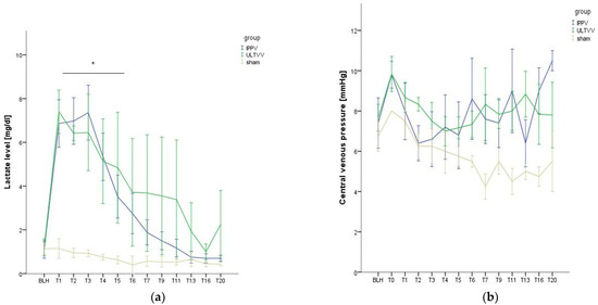 Hemodynamic stability. (a) Lactate levels as a function of time. (b) Central venous pressure as a function of time. Mean (±1 SE). * indicates p < 0.05 ULTVV and IPPV vs. sham treatment. BLH: baseline healthy. IPPV: Intermittent positive pressure ventilation. ULTVV: Ultra-low tidal volume ventilation. Tx: timepoint.