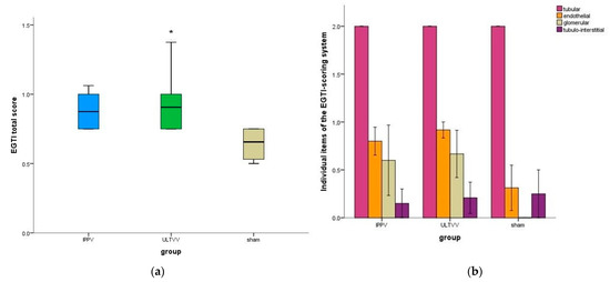 Postmortem analysis of kidney tissue shows a significantly higher EGTI total score for ULTVV vs. Sham (p = 0.038); for IPPV vs. Sham there was no significant difference (p = 0.063). There was no significant difference between the intervention groups (p = 0.931) (Figure 3a). For the individual items of the EGTI score, there were no significant differences between the intervention groups (Figure 3b).