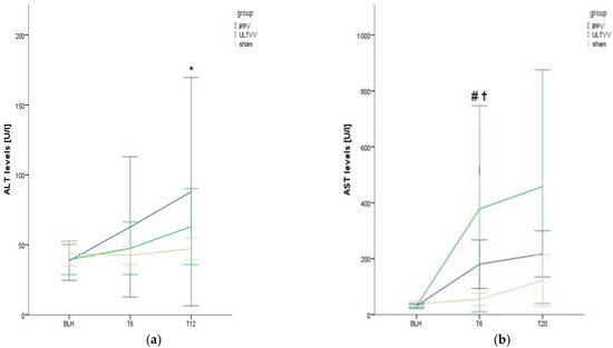 Aspartate aminotransferase (AST) levels as a function of time increased in all groups, with significant increases in the IPPV group (p = 0.043 BLH vs. T6) and the ULTVV group (p = 0.028); these did not significantly increase at T20 (p = 0.345 IPPV T6 vs. T20 and p = 0.753 ULTVV T6 vs. T20) (Figure 4b). Such an increase could not be observed in the sham group (p = 0.273 BLH vs. T6). Meanwhile, at T6 there was a significant difference between the respective intervention group and the sham group (p = 0.016 IPPV and p = 0.038 ULTVV); there were no significant differences found between the intervention groups (p = 1.0 T6 and p = 0.537 T20).