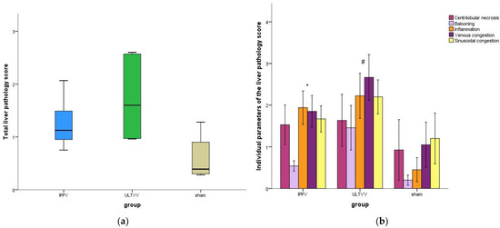 Histopathological scoring of the liver. (a) Total liver pathology score. (b) Individual parameters of the liver pathology score. Mean (±1 SE). * indicates p < 0.05 for IPPV vs. sham # indicates p < 0.05 for ULTVV vs. Sham. IPPV: Intermittent positive pressure ventilation. ULTVV: Ultra-low tidal volume ventilation.