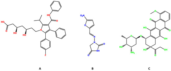Chemical structure of the drugs applied in this project: (A) atorvastatin, (B) nitrofurantoin, and (C) doxorubicin.