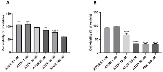 Effect of ATOR on the viability of MCF-7 (A) and SH-SY5Y (B) cells. The cells were cultured in the presence of increasing concentrations of ATOR. After 48 h, MTT assay was performed to measure cell viability. Values are expressed as percentages and represent the means ± SEM. Each experiment was performed three times independently (n = 3). One-way ANOVA was used as statistical test. Statistically significant ** p < 0.01, and **** p < 0.0001 vs. vehicle.