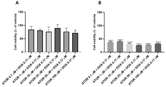 Effects of combining DOX with ATOR on cell viability of MCF-7 (A) and SH-SY5Y (B) cells. Cells were cultured in the presence of a single concentration of DOX (0.17 µM) and with increasing concentrations of ATOR. After 48 h, the MTT assay was performed to measure cell viability. Values are expressed as percentages and represent means ± SEM. Each experiment was performed three times independently (n = 3). One-way ANOVA was used as statistical test. Statistically significant * p < 0.05, and **** p < 0.0001 vs. vehicle.