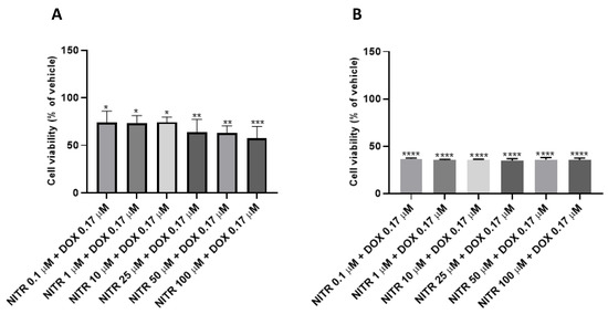 Effects of combining DOX with NITR on cell viability of MCF-7 (A) and SH-SY5Y (B) cells. The cells were cultured in the presence of a single concentration of DOX (0.17 µM) and with increasing concentrations of NITR. After 48 h, MTT assay was performed to measure cell viability. Values are expressed as percentages and represent means ± SEM. Each experiment was performed three times independently (n = 3). One-way ANOVA was used as statistical test. Statistically significant * p < 0.05, ** p < 0.01, *** p < 0.001, and **** p < 0.0001 vs. vehicle.