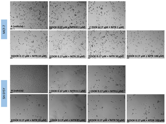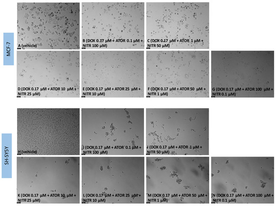 Microscopic visualization of the effects of combining DOX with ATOR and with NITR on the morphology of MCF-7 and SH-SY5Y cells for 48 h. Cells were treated with (A,H) 0.1% DMSO (control), (B,I) 0.17 µM DOX + 0.1 µM ATOR + 100 µM NITR, (C,J) 0.17 µM DOX + 1 µM ATOR + 50 µM NITR, (D,K) 0, 17 µM DOX + 10 µM ATOR + 25 µM NITR, (E,L) 0.17 µM DOX + 25 µM ATOR + 10 µM NITR, (F,M) 0.17 µM DOX + 50 µM ATOR + 1 µM NITR, or (G,N) 0.17 µM DOX + 100 µM ATOR + 0.1 µM NITR. Scale bar: 50 µm; 100× total magnification.