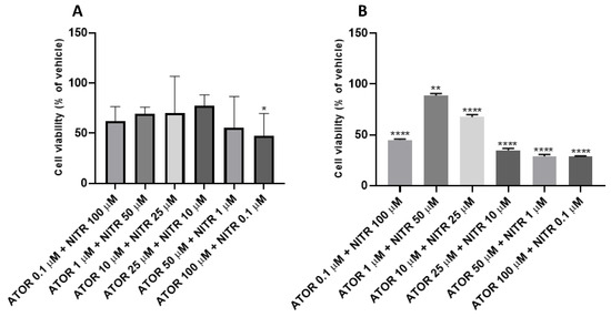 Effects of the combination of ATOR and NITR on cell viability of MCF-7 (A) and SH-SY5Y (B) cells. The cells were cultured in the presence of concentrations between 0.1 and 100 µM of ATOR and NITR. After 48 h, MTT assay was performed to measure cell viability. Values are expressed as percentages and represent means ± SEM. Each experiment was performed three times independently (n = 3). One-way ANOVA was used as statistical test. Statistically significant * p < 0.05, ** p < 0.01, and **** p < 0.0001 vs. vehicle.
