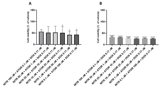 Effects of combining DOX with ATOR and with NITR on cell viability of MCF-7 (A) and SH-SY5Y (B) cells. The cells were cultured in the presence of concentrations between 0.1 and 100 µM of ATOR and NITR. After 48 h, MTT assay was performed to measure cell viability. Values are expressed as percentages and represent means ± SEM. Each experiment was performed three times independently (n = 3). One-way ANOVA was used as statistical test. Statistically significant * p < 0.05, and **** p < 0.0001 vs. vehicle.