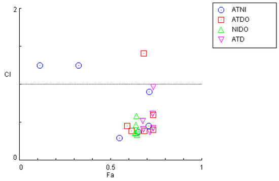 Fa–CI plot of combinations in SH-SY5Y cell line. Combinations: ATOR + NIT (blue), ATOR + DOX (red), NIT + DOX (green), and ATOR + NIT + DOX (pink).