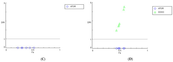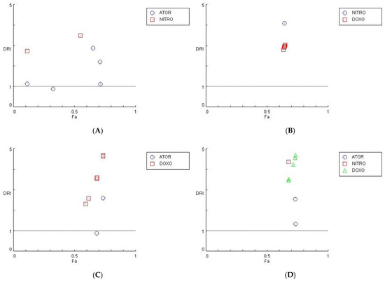 Fa–DRI plot of combinations in SH-SY5Y cell line. Combinations: ATOR + DOX (A), NIT + DOX (B), ATOR + NIT (C), and ATOR + NIT + DOX (D).