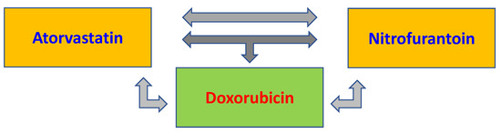 There are few references to the interaction between the drugs nitrofurantoin together with atorvastatin, but a possible indication is that it may increase the risk of nerve damage. We intended to understand the effect of these drugs on cancer cells alone and then combined with a potent reference drug doxorubicin, as well as a combination of the three. No work of this kind has ever been performed, and new evidence was found to better understand the combination of nitrofurantoin with atorvastatin.
