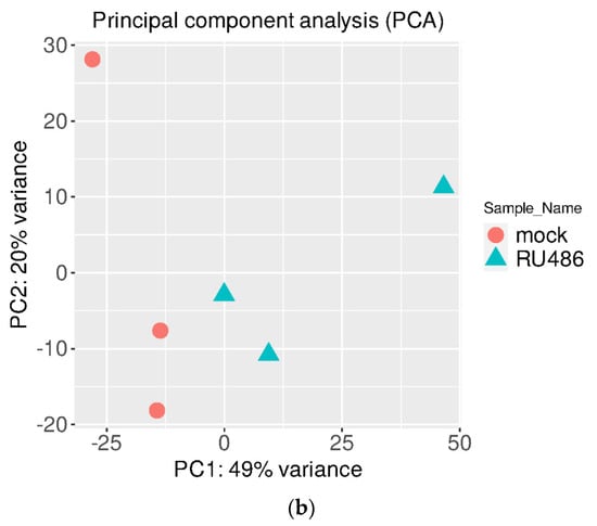 After using a pairwise approach, we used three embryos in the same group to eliminate the background noise caused by transcriptions unique to individuals, thus allowing us to acquire more relevant data from the two groups. Further RNAseq analysis was conducted by using iDEP web software [http://bioinformatics.sdstate.edu/idep/ (accessed on 30 June 2021)]. The Pearson correlation coefficients (R2) between every sample pair were calculated based on FPKM (Fragments Per Kilobase per Million); values were obtained as shown in Figure 1a. In addition, the principal component analysis (PCA) was also performed in Figure 1b. The results showed high correlation and similarity among the control and RU-486 samples, and it suggests that the RU-486 treatment may affect the expression of a small subset of genes.
