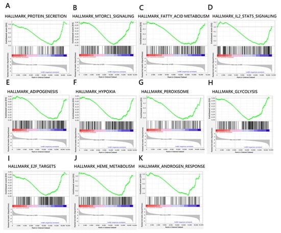 Enrichment plots indicated significantly enriched gene sets (FDR q-value < 0.25; NOM p-value < 0.05) for embryos treated with RU-486 compared with mock control. (A–K) show negative enriched score (ES) where the leading edge subset appears in the valley score of the subsequent ranked list.
