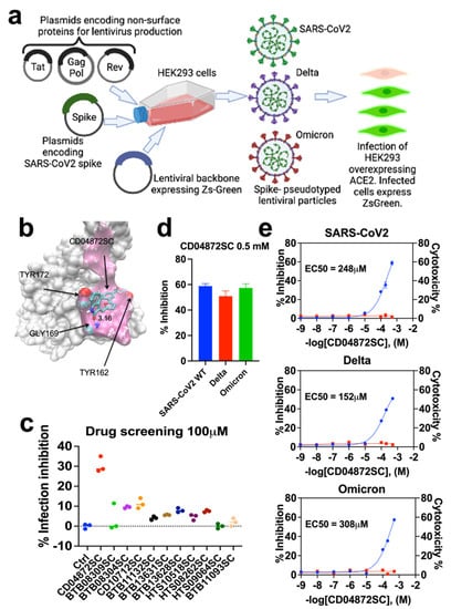 To corroborate our in-silico data, cell infection and viability assays were carried out to measure the effects of these top 15 compounds on cell infection rates and cell cytotoxicity. HEK293 cells (ATCC-1586) overexpressing the ACE2 receptor were infected with lentiviruses that express the spike protein found in SARS-CoV-2 [] (Figure 1a). Next, in the presence of the compounds identified from the in silico data, we measured the green fluorescence intensity of ZsGreen1 protein 48 h post-infection. Next, this assay was repeated by independently expressing the Spike protein’s variants, Delta and Omicron, also in HEK293 cells overexpressing the ACE2 receptor (Figure 1a). These in vitro SARS-CoV-2 spike proteins and ACE2 receptor co-expression cellular studies confirmed the in-silico molecular strategy that aimed at disrupting the interface of the SARS-CoV-2 spike protein and ACE2 receptor by docking a small molecule at the receptor-binding site of the spike protein (Figure 1b). We then performed infection inhibition drug screening and cell cytotoxicity assays. From the drug screening assays, we identified CD04872SC as our lead compound (Figure 1c). We then validated this lead compound by determining its infection rate. We found that CD04872SC showed a half-maximal effective concentration (EC50) = 248 μM; the concentration capable of reducing the viral infection of the cells expressing the SARS-CoV-2 spike protein (Figure 1d). Furthermore, we were able to observe that CD04872SC also inhibited the infection of the SARS-CoV-2 variants; Delta (EC50 = 152 μM) and Omicron (EC50 = 308 μM) (Figure 1d). Finally, this CD04872SC lead compound was then tested at various concentrations in cell cytotoxicity assays using the PrestoBlue™ Cell Viability Reagent (Life Technologies, Carlsbad, CA, USA, Cat. No. A13261) kit, and we found that CD04872SC was without major cell cytotoxicity within the indicated concentrations (Figure 1e). It would be interesting to study the potential cytotoxicity in other cell models such as the endothelial, hepatic, and renal cells.