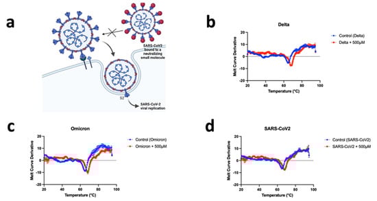 CD04872SC binds to the spike protein of SARS-CoV-2, Delta, and Omicron. (a) Schematic representation of the viral neutralization concept of SARS-CoV2 by a small molecule. Targeting a specific region of the spike proteins makes it possible to neutralize the coronavirus by disrupting the binding between its spike protein and receptor ACE2. (b) The thermal stability of the Delta variant pseudotyped lentiviral particles in the absence and presence of 500 μM CD04872SC. (c) Thermal shift assay performed with Omicron variant pseudotyped viral particles in the absence and presence of 500 μM CD04872SC. (d) Thermal stabilization of SARS-CoV2 pseudotyped viral particles in the presence of 500 μM CD04872SC. The results are expressed as the mean of three experiments performed in triplicate; each triplicate was averaged before calculating the s.e.m. Lead compound CD04872SC is part of a “U.S. Provisional Patent Application No. 63/312,351, filed on Monday, 21 February 2022”.