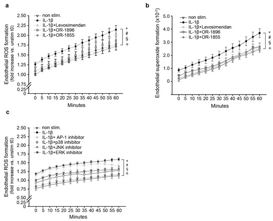 Influence of levosimendan metabolites on inflammatory ROS formation. (a) Pre-incubation with levosimendan, OR-1855, and OR-1896 (10 µM; 30 min), and subsequent stimulation with Il-1β (10 ng/mL) resulted in decreased ROS production in endothelial cells (all n = 7 in hexlicates; * p < 0.05 nonstim. vs. IL-1β at all time points; # p < 0.05 IL-1β vs levosimendan at 25 and 60 min; § p < 0.05 IL-1β vs OR-1896 at 25 and 55 min.; + p < 0.05 IL-1β vs. OR-1855 at 25, 55 and 60 min.), as assessed by H2-DCF oxidation. (b) Pre-incubation with levosimendan, OR-1855, and OR-1896 (10 µM; 30 min), and subsequent stimulation with Il-1β (10 ng/mL) impaired superoxide radical formation in endothelial cells (n = 3–6 in hexlicates; * p < 0.05 nonstim. vs. IL-1β 10–25 min.; # p < 0.05 IL-1β vs levosimendan at 0–25 min.; § p < 0.05 IL-1β vs OR-1896 at 0–25 min.; + p < 0.05 IL-1β vs OR-1855 at 0–25 min), measured by cytochrome c reduction. (c) Pre-treatment (30 min) with AP-1 inhibitor (S11302; 1 µM), p38 inhibitor (SB 202190; 10 µM), JNK inhibitor (SP 600125; 1 µM), and ERK inhibitor (PD 98059; 10 µM) and subsequent stimulation with Il-1β (10 ng/mL) diminished ROS production in endothelial cells (all n = 10 in hexlicates; * p < 0.05 nonstim. vs IL-1β at all time points; # p < 0.05 IL-1β vs. p38 inhibitor at all time points.; § p < 0.05 IL-1β vs. JNK inhibitor at all time points; + p < 0.05 IL-1β vs. ERK inhibitor at all time points).