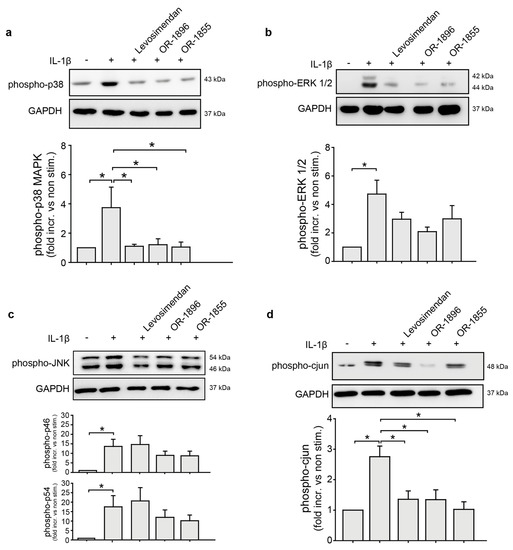 Impact of levosimendan, OR-1855, and OR-1896 on endothelial inflammatory MAPK signalling. Endothelial cells were pre-incubated with levosimendan, OR-1855, OR-1896 (10 µM; 30 min.), or sham solution (DMSO v/v) followed by stimulation with IL-1β (10 ng/mL) for 30 min before lysis and subsequent western blotting. (a) Levosimendan, OR-1855, and OR-1896 decreased IL-1β-dependent phosphorylation of p38 MAPK (n = 4). (b) Levosimendan, OR-1855, and OR-1896 decreased IL-1β-dependent phosphorylation of ERK1/2 MAPK (n = 4–5). (c) OR-1855 and OR-1896 diminished IL-1β-dependent phosphorylation of JNK (n = 15), while levosimendan had no effect (n = 15). (d) Levosimendan, OR-1855, and OR-1896 decreased IL-1β-dependent phosphorylation of cjun (AP-1) (n = 7). The graphs show protein band densities of phosphorylated forms of the MAP Kinases and cjun normalized to GAPDH (* p < 0.05).