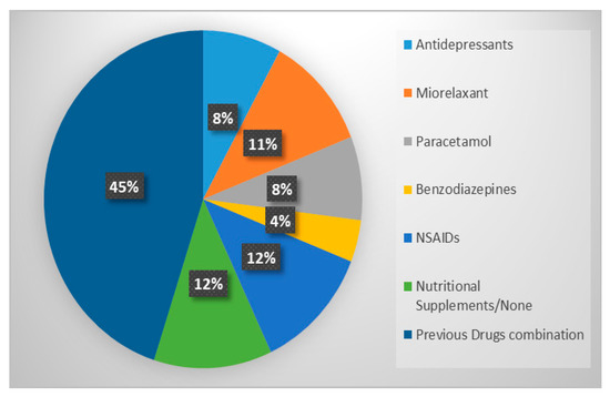 All the patients were following a pharmacological therapy, stable for three months before enrollment: 8% antidepressants, 11% myorelaxants, 8% paracetamol, 4% benzodiazepines, 12% NSAIDs, 12% nutritional supplements and 45% previous drug combinations (Figure 1). None used opioids for pain treatment (see exclusion criteria, Section 2.2).
