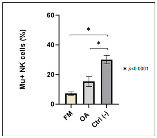 Blood samples were analyzed through flow cytometry in order to detect the percentage of expression of Mu+ NK cells. We found intra-group homogeneity (FM mean: 7.3 ± 1.2; OA mean: 15.46 ± 3.4; Ctrl (-) mean: 30.18 ± 2.8), and we registered differences in the percentage of expression of Mu+ NK cells between Ctrl (-) and FM (p < 0.0001) and between Ctrl (-) and OA (p < 0.0001) (Figure 2).