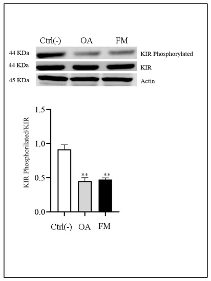 KIR expression on NK cells in FM and OA patients and the Ctrl (-). KIR and KIR phosphorylated were first normalized with actin, and then, these values were used to obtain a phosphorylated/total KIR ratio. The results are expressed as the mean ± SEM for 6 patients. ** p < 0.005 vs. Ctrl (-).