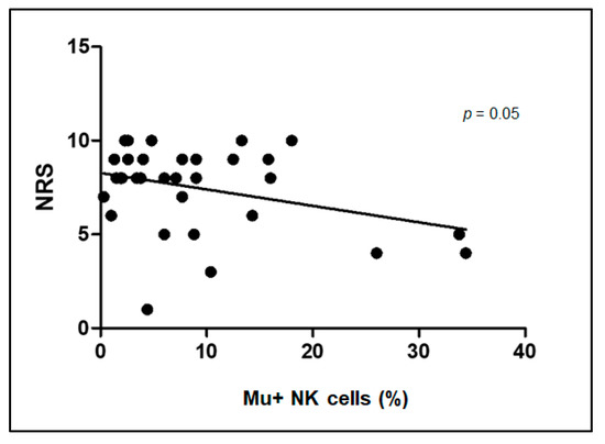 Trend of negative correlation between Mu+ NK cell percentage and NRS values. Linear regression: R square = 0.11; p = 0.05.