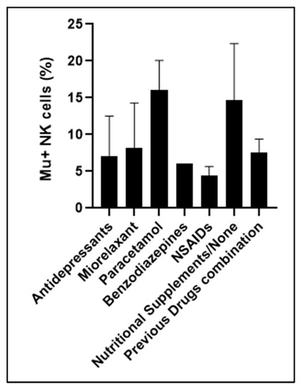 OA patients, who usually suffer inflammatory pain, took paracetamol as the first medication. On the other hand, FM patients usually need a combination of different drugs, considering pain and psychiatric comorbidities. Here, we analyzed the following pharmacological subgroups in order to detect the percentage of expression of Mu+ NK cells in comparison with a specific therapy: antidepressants, myorelaxants, paracetamol, benzodiazepines, NSAIDs, nutritional supplement/none, and previous drug combinations. We found that, despite the different pharmacological medications, the percentage of Mu receptor on the NK cell surfaces was almost identical across the subgroups (mean 6) (Figure 5).