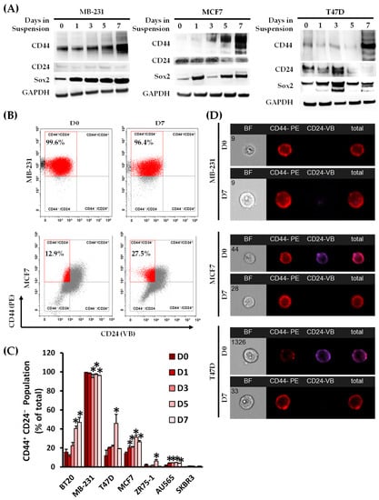 Identification of a panel of breast cancer cell lines with emergent anoikis-resistant cancer stem cell populations. (A) A panel of seven breast cancer anoikis-resistant cell lines was evaluated for cancer stem cell markers CD44, CD24, and Sox2 following culturing in either a monolayer (day 0) or non-adherent suspension condition for up to seven days using immunoblotting. Total protein expression for CD44 and Sox2 was increased over the seven days of culturing relative to the monolayer condition. CD24 was decreased in the MCF7 and T47D cell lines, and low expression was maintained in the MB-231 cell line. Immunoblot images are representative of 3 biological replicates. (B) The surface expression of CD44 and CD24 was analyzed using multispectral imaging flow cytometry (MIFC), and the CD44+CD24− population was quantified from the bivariate graph (C). The data shown are the percentages of CD44+CD24− cells out of the total population. Bivariate charts were gated on the isotype controls for each marker. (n = 3, * p < 0.05 relative to the monolayer culture (D0)). (D) MIFC images were taken of individual cells at each time point, and representative images for MB-231, MCF7, and T47D cells at days 0 (D0) and 7 (D7) of suspension culturing are shown. Assigned cell number of population is shown on the brightfield images.
