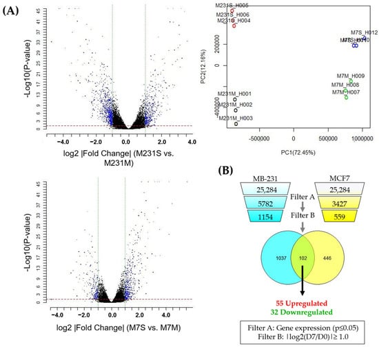 To identify a transcriptomic profile of cCSCs across breast cancer subtypes, a DNA microarray (HumanOne Array) was performed on RNA samples prepared from MCF7 and MB-231 cells grown in monolayer or suspension culture for seven days []. Principal component analysis (PCA) plotting was performed, confirming the reproducibility of the gene expression patterns with the clustering of the replicates and the separation of the monolayer and suspension cultures per cell line (Figure 2A). Gene expression was narrowed down to only analyze those genes with significant dysregulation between day 7 (suspension culture) relative to Day 0 (monolayer culture) (log2|fold change (suspension (D7)/monolayer (D0))| ≥ 1, p < 0.05), which are shown in the volcano plot (Figure 2A,B) []. The expression profile of the impacted genes following suspension culture was then compared between MCF7 and MB-231 cells, identifying 102 common genes. These were discriminated to examine the genes that were upregulated (55 genes) or downregulated (33 genes) by suspension culture in both cell lines. The upregulated and downregulated gene profiles were analyzed separately, using DAVID to identify the most impacted signaling pathways (Tables S2 and S3). The response to hypoxia, the positive regulation of angiogenesis, canonical glycolysis, extracellular matrix reorganization, and HIF-1 signaling were the most significantly impacted gene ontology (GO) biological pathways and KEGG pathways in the upregulated gene expression panel, indicating that the suspension culture activated hypoxia-induced metabolic reprogramming in both cell lines (Tables S2 and S3). CSCs are reported to secrete angiogenic factors, aiding the pre-metastatic niche []. The analysis of the downregulated genes showed that the innate immune response pathway was significantly impacted, which may indicate that the suspension-induced CTCs may evade immune surveillance and potentially inhibit immune targeting.
