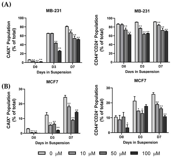 The cBCSC and CAIX populations are inhibited following treatment with U-104 under suspension. (A) MB-231 and (B) MCF7 cells were cultured in a monolayer (D0) or suspension condition for 3 or 7 days and then treated with 0, 10, 50, or 100 µM of U-104 for 24 h. Treated cells were then analyzed for CD44, CD24, and CAIX surface expression using MIFC. The CAIX+ and the CD44+CD24− decreased in a dose-dependent manner with U-104 treatment. (n = 3, * p < 0.05, ** p < 0.01).
