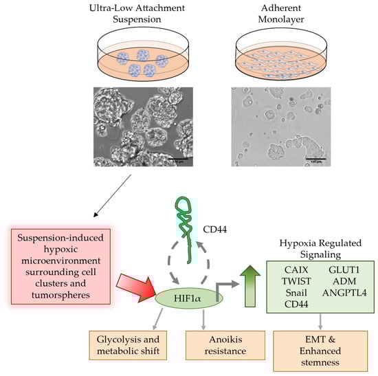 Suspension culture induces hypoxia-regulated signaling in tumor cell clusters and spheres. BCCs cultured in a non-adherent suspension condition may result in a hypoxic microenvironment surrounding the “circulating” tumor spheres and clusters. The activation of hypoxia-regulated signaling through HIF1α resulted in increases in CAIX, TWIST, Snail, and GLUT1 expression, which are known EMT factors that result in enhanced stemness of the BCSC. CD44 and HIF1 act in a positive feedback loop through PI3K/AKT signaling, resulting in sustained CD44+ cells through the 7 days of culture. CAIX is a potential marker that may be used to monitor or act as a therapeutic target for hypoxia-enriched cCSCs.