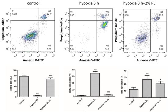 The percentage of the non-apoptotic (lower left quadrant), early apoptotic (lower right quadrant), and late apoptotic or necrotic cells (upper right quadrant) was assessed by Annexin V and propidium iodide staining. The results from flow cytometry analyses indicated that the early stage apoptosis rate was significantly increased after 3 h hypoxia exposure (Figure 5), which was ameliorated by PL treatment (* control vs. hypoxia 3 h group; *** p < 0.001; + control vs. hypoxia 3 h group+2% PL; +p < 0.05, +++ p < 0.001; # hypoxia 3 h vs. hypoxia 3 h group+2% PL group. ### p < 0.001).