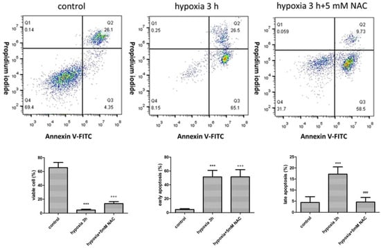 The results from flow cytometry analyses indicated that 5 mM NAC significantly decreased the late stage apoptosis (Figure 6) (* control vs. hypoxia 3 h group; *** p < 0.001; + control vs. hypoxia 3 h group+5 mM NAC; +++ p < 0.001; # hypoxia 3 h vs. hypoxia 3 h group+5 mM NAC group, ### p < 0.001).