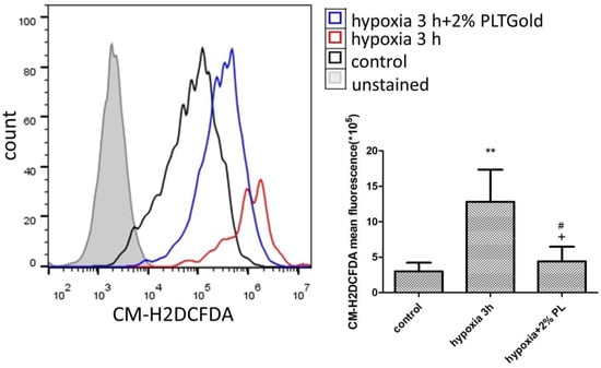 Flow cytometry of CM-H2DCFDA staining for ROS in hypoxia 3 h with or without 2% PL. (n = 5, * control vs. hypoxia 3 h group; ** p < 0.01; + control vs. hypoxia 3 h group + 2% PL; + p < 0.05; # hypoxia 3 h vs. hypoxia 3 h group + 2% PL group. # p < 0.05).