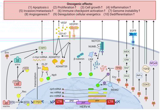 A detailed study of the HERV-K (HML-2) env knockdown through RNAi revealed the involvement of the viral gene in cellular pathways playing key roles in cancer (e.g., EGFR, TGF-β, NF-κB, MYC, p53, HRAS, KRAS, and MAPK1/3) (Figure 2) []. Overexpression of HERV-K (HML-2) env, on the other hand, increased breast cancer cell transformation, migration, and invasion, as well as restored the cancer-related signaling pathways mentioned above alongside the downregulation of p53 (HGNC: TP53) []. Additionally, microarrays identified HERV-K (HML-2) Env protein as a strong inducer of the MAPK pathway via upstream TFs [], and examinations of the DNA methylome and TF-binding data revealed several HERV LTR77-driven TFs such as NF-κB (HGNC: NFKB1) and RAD21 [,]. Besides HERV-K (HML-2) Env, HERV-K (HML-2) non-structural nuclear protein Np9 has been described to interact with cellular proteins []. Np9 destabilizes LNX1, an E3 ubiquitin ligase, that targets members of the NUMB/NOTCH1 pathway for degradation [,]. NOTCH1 regulates cell differentiation, cellular metabolism, cell cycle progression, angiogenesis, self-renewal, and immune function [] and has been shown to be deregulated in breast cancer []. Another ubiquitin ligase directly bound by Np9, which has been found upregulated in breast and other cancers, is MDM2 []. Contrary to the inhibition of p53 observed for HERV-K (HML-2) Env, Np9 has been reported to interfere with the MDM2 ubiquitin ligase activity toward p53 in the cell nucleus and thus increases p53 levels while being ubiquitinated itself []. Furthermore, Np9 was discovered to result in an upregulation of CD147 (HGNC: BSG) []. CD147 is a coreceptor for VEGFR2 (HGNC: KDR) and has been demonstrated to induce VEGFA [,] in addition to ADAMTS1 and ADAMTS9 []. Both VEGFA/VEGFR2 and ADAMTS1/9 signaling are reported inducers of metastasis and angiogenesis in several cancers [].