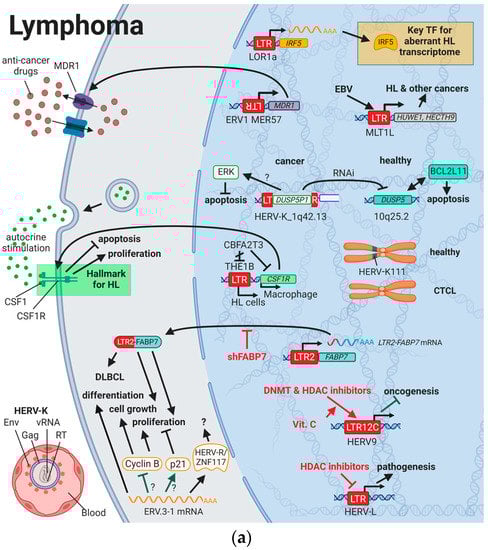 There are only two studies reporting antibodies against HERVs in 2–6% of patients with lymphoma (N = 288) [,]. This could be due to reduced immune function in these patients or the very nature of HERV integration in lymphoma development. Transcriptional activation of normally dormant oncogenes by HERV LTRs, so called promoter exaptation, appears to play a much larger role during lymphocyte transformation than the interference in cancer pathways by HERV proteins or gene products, thus providing no targets for the immune system []. The first ever described case of retroviral promoter exaptation was the expression of the CSF1 receptor (CSF1R) in HL cells discovered by Lamprecht et al. (2010) []. Autocrine stimulation by the macrophage growth factor CSF1 has been shown to be essential for the proliferation and survival of HL cells, and lineage inappropriate expression of the CSF1R has become a hallmark in HL []. In contrast to regular macrophages, CSF1R in HL cells is driven by the THE1B LTR located 6.2 kb upstream of the locus and has been linked to loss of transcriptional repressor CBFA2T3 expression []. In a similar way, normally brain-expressed fatty acid-binding protein 7 (FABP7) was observed to be expressed as a chimeric isoform with LTR2 in tissues from patients with DLBCL []. RNAi-mediated knockdown of FABP7 resulted in decreased proliferation and growth of DLBCL, suggesting a dependence on FABP7 expression []. A third example of promoter exaptation is the upregulation of IRF5 driven by the demethylated LOR1a LTR element that was specifically detected in HL cell lines []. IRF5 is a key regulator of the aberrant transcriptome in HL and crucial for HL cell survival [].