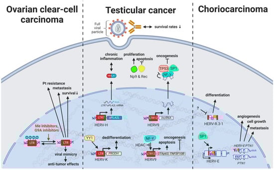 Although the secretion of HERV viral particles was first detected in placenta by Kalter et al. (1973) [], three years later, testicular tumors became the first cancer tissue described to selectively release HERV viral particles []. Since then, testicular cancer cell lines serve as a model for HERV-K particle assembly and the effects of HERV-K protein expression on cell functions [,,]. Cellular transcription factor YY1 was shown to specifically activate LTRs in teratocarcinoma cell lines [] with the HERV-K (HML-2) LTR in Tera-1 cells becoming as strong of a promoter as the SV40 early promoter (Figure 5) []. Interestingly, several distinct testicular cancer cell lines and tissues were demonstrated to each specifically drive expression of reporter plasmids under different HERV-K (HML-2) LTR promoters [,]. Moreover, Mueller et al. (2018) revealed the capability of HERV-K (HML-2) to induce neighboring genes such as PRODH in germ cell tumors (GCT) that paralleled with the differentiation status of the cancer cells []. In this way, expression of genes adjacent to HERV-K (HML-2), which is highest in undifferentiated cells, may provide an additional indicator of the tumor status []. Conversely, transcription factor NFY induces HERV-9 LTR12-mediated transcription of tumor suppressors in normal testis, which is silenced in testicular cancer [,].