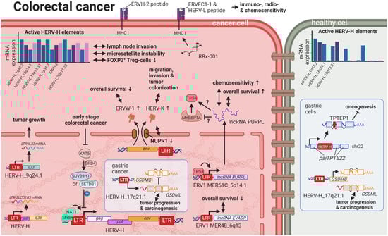 Colorectal cancers (CRCs) are among the most common cancers worldwide with strikingly low 5-year survival rates of less than 65–70% in Northern America, Australia/New Zealand, and many European countries []. While early diagnosis has markedly improved for older patients due to routine screenings in individuals >50 years of age, rising rates in the population under 45 years of age highlight the need for improved non-invasive prognostic and diagnostic tools []. In the last decade, research has started to focus on the influence of HERV elements on CRCs and has revealed interesting interactions, especially involving HERV-H. With over 1000 loci in the human genome, HERV-H is the most abundant HERV family carrying coding regions in the human genome [].