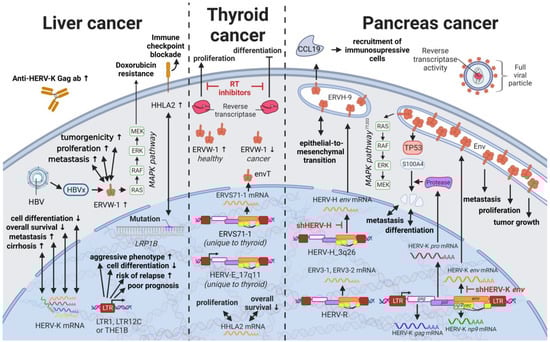 Despite their rarity, endocrine tumors, particularly thyroid cancers, have dramatically increased in their incidence worldwide in the last four decades [,]. Additionally, anaplastic thyroid cancer [] and adrenocortical carcinoma [] have incredibly short survival times due to their aggressive nature, while pancreatic ductal adenocarcinoma is often associated with increased risk for metastasis and high mortality rates due to a lack of symptoms in early stages [,]. In pancreatic cancer, HERV-K (HML-2) has been suggested as a major tumor driver. Li et al. (2017) reported HERV-K (HML-2) env, gag, and np9 genes as well as HERV-K (HML-2) Env protein expression to be significantly increased in pancreatic cancer cell lines as well as patients with pancreatic cancer compared to healthy controls (Figure 7) []. The RNAi-mediated knockdown of HERV-K (HML-2) env reduced proliferation and colony formation of the cancer cell lines and resulted in decreased tumor growth and metastasis in an in vivo mouse model []. Pathway analysis by Li et al. revealed an activation of the RAS/MEK/ERK pathway and inhibition of TP53 by HERV-K (HML-2) in pancreatic cancer cells [], which was confirmed in breast cancer cells by Lemaître et al. (2017) (see Results HERVs in Breast Cancer—The Rise of New Biomarkers) []. Furthermore, the cleavage of S100A4 by the HERV-K (HML-2) protease was associated with cell cycle progression, differentiation, and metastasis in pancreatic cancer []. Moreover, Li et al. detected increased expression of ERV3-1 and ERV3-2 transcripts in prostate cancer cell lines []. These transcripts displayed an intact open reading frame in most cell lines, potentially giving rise to active Env proteins []. Interestingly, Li et al. also observed the release of viral-like particles with increased RT activities by pancreatic cancer cell lines Panc-1 and Panc-2, suggesting the potential horizontal transfer of viral proteins [].