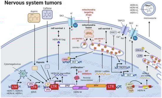 The role of HERVs in nervous system tumors. Evaluated treatments are marked in red. Abbreviations: K+ = potassium, Ca2+ = calcium, ab = antibody, LTR = long terminal repeat, gag = group antigen (capsid), pol = polymerase, RT = reverse transcriptase, env = envelope, HERV-K = HML-2.