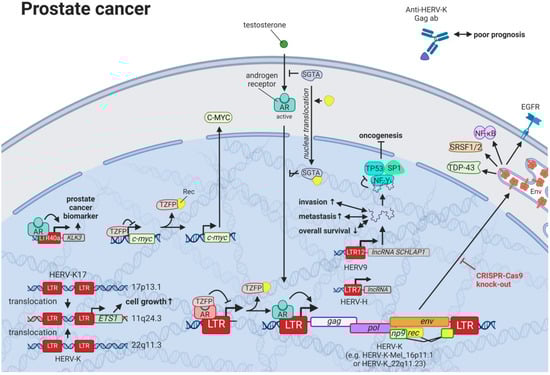 Prostate cancer is the most frequent cancer in males in Western countries and the second most common cancer in males worldwide []. Despite increased survival rates, curative treatments, such as surgery and radiation, convey serious side effects [], so that active surveillance becomes the preferred approach for men with less-aggressive prostate cancer. Directed therapies targeting HERVs that are reportedly dysregulated in prostate cancer cell lines and tissues present a milder approach for prostate cancer treatment. A prime candidate in prostate cancer is HERV-K, which exhibits tight interactions with the testosterone receptor. While certain HERV-Ks, such as HERV-K17 on chromosome 17p13.1 (not HGCN: ERVK-17), show tissue-specific upregulation in prostate cells and downregulation in malignant cells [,], other members of the family, such as HERV-K-Mel (HML-6) on chromosome 16p11.1 [] and HERV-K (HML-2) on chromosome 22q11.23 [,], display significantly higher expression in prostate cancer tissues and cell lines compared to healthy controls (Figure 9). This increased expression was identified to be androgen-dependent with several HERV-K (HML-2) LTRs containing predicted steroid hormone receptor-binding sites []. HERV-L LTR40a was shown to exhibit ligand-dependent recruitment of the androgen receptor (AR) functioning as an enhancer for KLK3 []. KLK3 is the most well-studied biomarker for prostate cancer and is a model system to study androgen signaling []. As prostate cancer cell survival is highly dependent upon AR signaling, LTR40a induction might provide an alternative marker for disease detection. Additionally, inhibition of the LTR40a and its associated gene products could prevent the synthesis of HERV-regulated oncogenes. Reciprocal to the activation of HERV LTRs by the AR, HERV-K (HML-2) Rec has been documented to associate with the AR co-repressor, TZFP (HGNC: ZBTB32), relieving the TZFP-mediated repression of AR-induced transactivation []. Furthermore, HERV-K (HML-2) Rec binding of TZFP was reported to mitigate the direct transcriptional repression of the MYC gene promoter []. HERV-K (HML-2) Rec was also observed to inhibit the cytoplasmic negative regulator of the androgen receptor SGTA and lead to its translocation to the nucleus []. This in turn was shown to result in a higher sensitivity of the AR to its ligand in the cytoplasm and increased expression of AR-induced oncogenes as well as HERV-K (HML-2) gene products [].