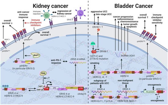 Several underlying mechanisms have been proposed to drive the inherently higher expression of piHERVs. On the genetic level, piHERVhigh patients demonstrated an enrichment of mutations in the BAP1 gene, which is a deubiquitinase known to functionally associate with chromatin modulators [,]. The functional disruption of BAP1 may thus lead to chromatin remodeling resulting in piHERV expression []. A subgroup of patients with ccRCC was found to express HERV-E in high amounts driven by a hypomethylated LTR []. Inactivation of the von Hippel–Lindau tumor suppressor gene (VHL) with subsequent stabilization of hypoxia-inducible transcription factors, HIF1A and -2A, was shown to induce expression of two HERV-E transcripts on chromosome 6q15 (HERV-E.CT-RCC-8 (HGCN: ERVE-4) and HERV-E.CT-RCC-9) through the HIF response element located in the viral LTR []. In other tumors and matched normal tissues, a hypermethylated LTR was reported to prevent the induction of the HERV-E.CT-RCCs []. Interestingly, recognition the HERV-E.CT-RCC-1 antigen, which carries a shorter sequence of the common region of HERV-E.CT-RCC-8 and -9, by T cells was associated with the regression of human kidney cancer following unrelated allogeneic stem cell transplantation, suggesting its potential as a target for antitumor therapies []. Strikingly, ERVE-4 expression was also able to predict the response to anti-PD-1 in metastatic ccRCC []. Additionally, the observation that ERVE-4- and hERV47000-derived epitopes were able elicit a tumor-restricted CD8+ T-cell response were the basis for an ongoing phase 1 trial evaluating the safety and efficacy of the infusion of ERVE-4 TCR-transduced CD8+/CD34+-enriched T cells (NCT03354390) []. In urothelial cell carcinoma (UCC), effects mediated by HERV-E have been found beneficial and detrimental dependent on the specific virus. For instance, HERV-Ec11 on chromosome 11p15.4 (HGCN: ERVE-2) was found to be expressed only in a subgroup of patients with UCC, while HERV-Ec8 on chromosome 8p23.1 (HGCN: ERVE-3) was detected only in non-malignant urothelial tissues []. Furthermore, HERV-Ec1 encoded on chromosome 1q31.1 has been observed to be located in antisense orientation to a cytosolic phospholipase A2 group IVA (PLA2G4A) that is dysregulated in many human tumors, and thus theorized to contribute to fine tuning of PLA2G4A and to have a potential role in oncogenesis of UCC [] (see also HERVs in Testicular Cancer—The Governors of Tumor Suppressor Genes).